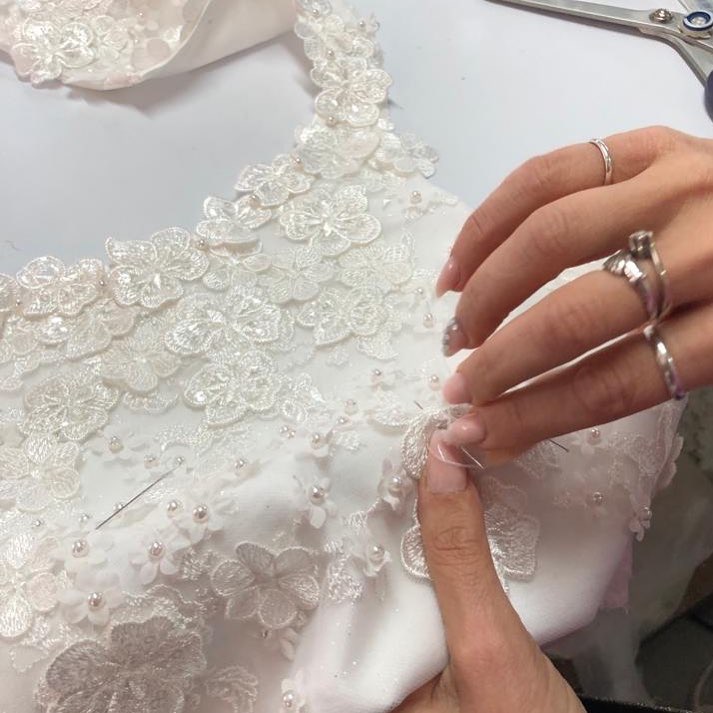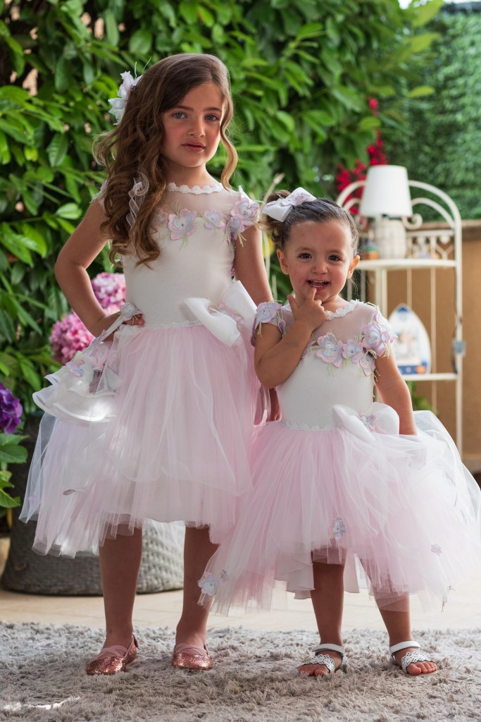 Coppia di abiti da damigella con corpino in body elastico con macramè e ricamo a piuma gonna a pizzi in tulle mano/seta – Capo Sartoriale Prodotto dai Fratelli Bramante Artigiani Napoletani